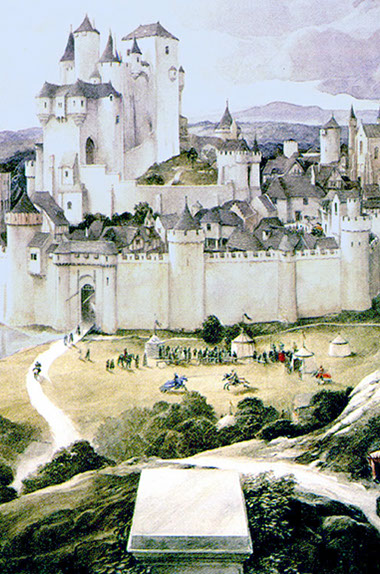 A call from Camelot Hello all you mortal humans We`re calling from a time gone by A time of trouble, troubadours and trials Of kings and queens in Camelot; When lords and ladies lived and died, When fellows fought and faeries feasted And woods were wild and mostly wet. On perilous plains the pagans prowled And dragons danced and giants jived. Magicians made a mound of mischief And sorceresses seemed so sweet, Though thee they really rather bothered. You will come to Camelot! You will be the company And take up challenges, go on quests, Show the sinew and face the foe. All daring damsels and dainty dames, Who weaken not, will win their wagers. Now notables and you new knights And squire scamps, receive your spurs For clever bravery and very soon Nor all the angry, antique ancients, Nor little people in the hills, With oaks and woad and mistletoe, Will ever cause you any fear. They will listen, they will hear Your perfect English flowing free, In speech and songs and skipping glee . Around the table Arthur`s knights And ladies feast the night away. The knights are gone, put out the lights And live the legends, on your bright new day